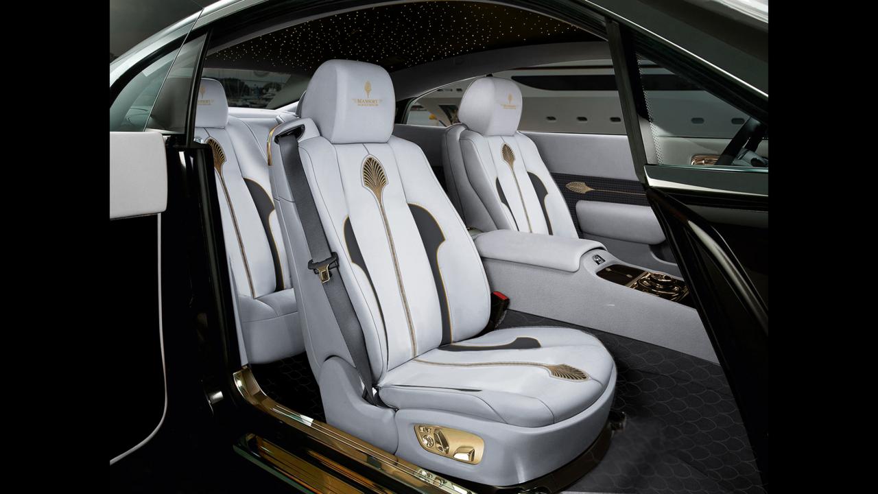 Η δουλειά Διχρωμία είναι νέα, όπως και οι ζάντες αλουμινίου 22-ιντσών, και οι εμβλήματα RR της Wraith που έχουν αποκολλημένα και αντικαταστάθηκε με Mansory κονκάρδες απλώνονται σε 0.999 καθαρό χρυσό. Mansory αναθεώρησε επίσης την εμφάνιση του Wraith με ένα scoopy αεροδυναμικό κιτ από ανθρακονήματα, πλήρης, με ριπή φώτα και σπόιλερ χείλη στην οροφή και decklid LED. Η καμπίνα διαθέτει περισσότερα από τα ίδια. Παρά το γεγονός ότι το μεγαλύτερο μέρος της χρυσής αναβαθμίσεις του 999 είναι faux, Mansory είναι γρήγορη να σημειωθεί ότι, κατόπιν αιτήσεως, οποιαδήποτε και όλα τα μεταλλικά μέρη, μέσα ή έξω, μπορεί να βυθιστεί στην πραγματική ουσία.