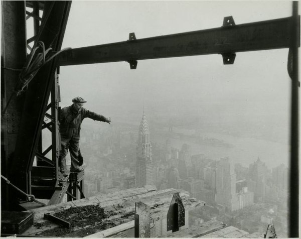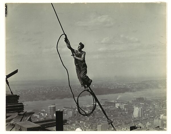 Ο Hine προσλήφθηκε για να απαθανατίσει την καταιγιστική κατασκευή του ουρανοξύστη μέσα σε μόλις 13 μήνες. Στα πλάνα του, εργάτες παλεύουν με δοκάρια, καλώδια, τούβλα και τον αέρα, δημιουργώντας την εικόνα μιας χώρας που ονειρευόταν να αγγίξει τον ουρανό. Εξάλλου, όπως έλεγε ο μεγιστάνας John Jakob Raskob, η Αμερική ήταν «ένας τόπος που έφτανε στα άστρα με τα πόδια στη γη».