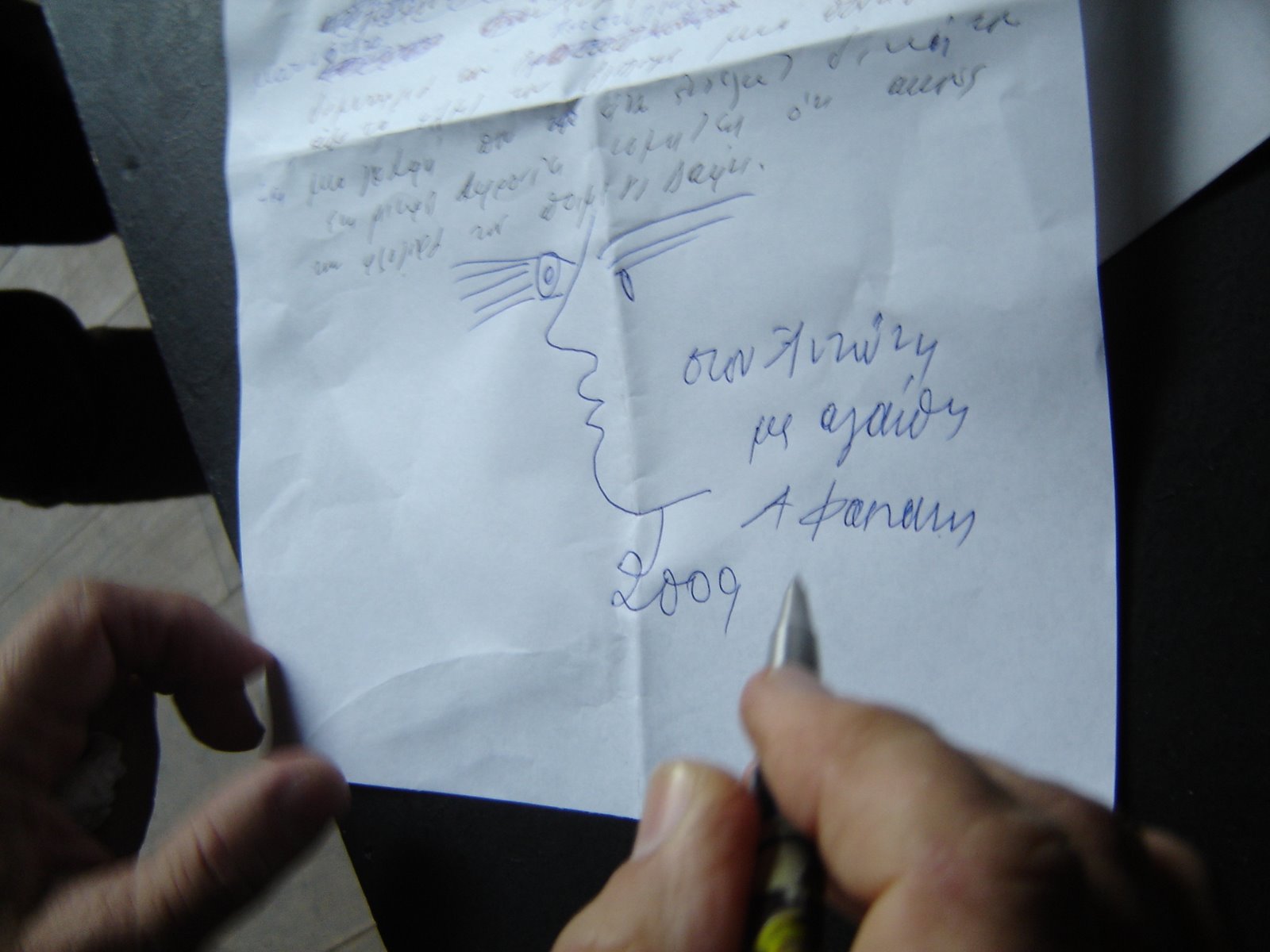 Τον θυμάμαι να εισέρχεται στο πλατό με μία μαύρη κάπα - μορφή καλλιτέχνη απ' αυτούς που δεν θα συναντήσεις εύκολα σήμερα. Είχε κάτι από μάγο, από μύστη, από ταχυδακτυλουργό θα έλεγα. Μήπως δεν ήταν ταχυδακτυλουργός όταν έπιανε ένα κομμάτι χαρτί κι ένα μολύβι και μπορούσε να σε ζωγραφίσει μέσα σε ελάχιστα λεπτά; Του ζήτησα, θυμάμαι, να μου έδινε, αν θα το ήθελε, την κομμένη από μπλοκ σελίδα με τις σημειώσεις που'χε γράψει για τον Κούνδουρο. Συμφώνησε, αλλά για να μη μου χάριζε απλά μία σελίδα με τις λέξεις του, έφτιαξε και ένα σχέδιο που είχε να κάνει με το σκοπό της συνάντησης μας, το κινηματογραφικό γύρισμα. Ένα παρεμφερές σκίτσο είχε φτιάξει και για την αφίσα του φεστιβάλ ταινιών μικρού μήκους Δράμας, το 2002, όταν είχαν έρθει μαζί με τον Διονύση Σαββόπουλο και είχαν δώσει μία πρωτότυπη μουσικο - εικαστική παράσταση. Ο Διονύσης έπαιζε τα τραγούδια του κι εκείνος ταυτόχρονα ζωγράφιζε μπροστά στο κοινό, αποτελούμενο ως επί το πλείστον από μικρομηκάδες σκηνοθέτες.