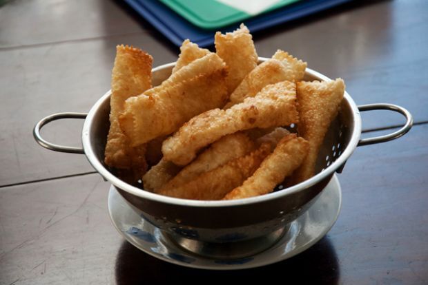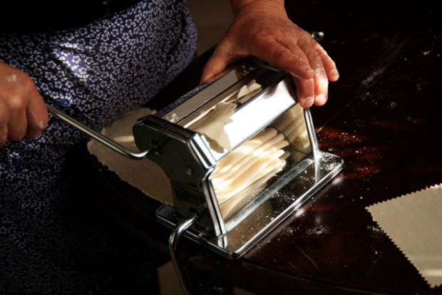 Αφού τα ανακατέψουμε όλα μαζί, ρίχνουμε νερό τόσο, όσο να δέσει η ζύμη. Μόλις είναι έτοιμη, την ανοίγουμε στη μηχανή, για να γίνει λεπτή, την κόβουμε σε τετράγωνα και τις άκρες με τη ροδέλα, “σαν κέντημα”. Για να τα τηγανίσουμε, το λάδι στο τηγάνι πρέπει να καίει. Τα γυρίζουμε μία από τη μία πλευρά και μία από την άλλη και τέλος τα στρίβουμε σαν σαλιγκάρι.